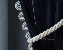 Декоративная тесьма с асимметричными волнами. Тесьма «волна» шириной 48 мм представляет собой три ряда шнура спирального плетения, параллельно изгибающихся и вплетённых в крупную репсовую тесьму шириной 15 мм, которая формирует расстояние между шнурами и проходит с небольшим смещением от центра, максимальный вынос волн 20 мм и 13 мм. Тесьма может быть настрочена самостоятельно на портьеры, подушки, покрывала, а также может закрыть и украсить собой швы стачивания полотен разных фактур и цветов. Кроме этого, может быть использована в украшении подхватов для портьер, т.к. ее рисунок идеально подходит для такого вида изделия. Комбинируется с арт 1101, 1103