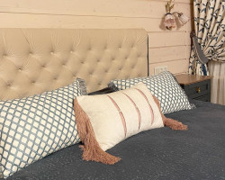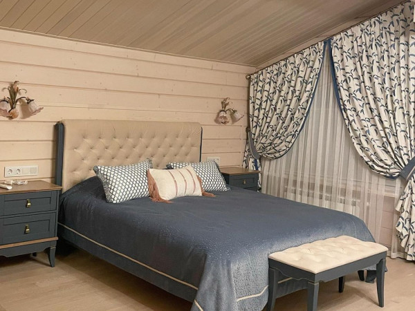 Спальня прекрасной хозяйки дома Сложная архитектура окон дома не помешала сделать комнату невероятно уютной. Обилие деталей, сочетание орнаментов отделки и конечно комфорта. Портьеры из вышитого хлопка, покрывало из мягчайшего бархата и конечно вишенка на торте это подушки. Сочетание фактур подарят разные тактильные ощущения. Работа Пономаревой Елены г. Москва