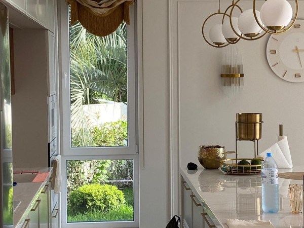 Акценты в деталях. В этом проекте это золото разных фактур, форм и оттенков. На кухню были выбраны римские шторы с мягкой подачей. Заострённые линии подчеркнули ритм люстры и настенных бра. P.s. Обратите внимание на обработку и детали. Работа Овчинниковой Анны студия EI'CO г. Сочи